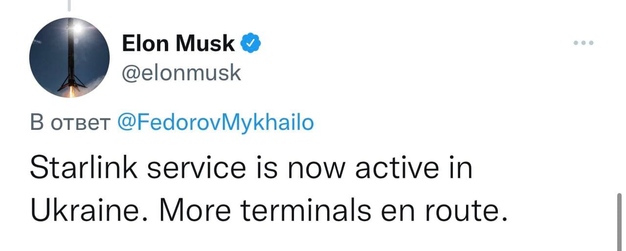 «Сервіс Старлінк вже активний в Україні. Термінали – в дорозі».