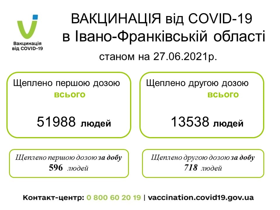 За минулу добу на Прикарпатті 596 людей щепили першою дозою, 718 людей щепили другою дозою.