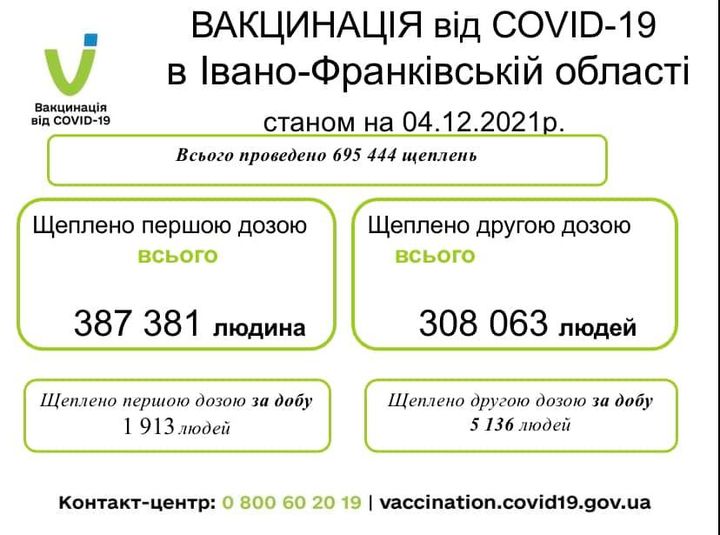 Загалом від початку вакцинальної кампанії на Прикарпатті першою дозою імунізували 387 381 жителя, другу дозу вкололи 308 063 людям.
