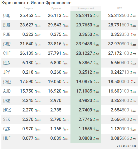 Пропонуємо ознайомитись з курсом валют в місті станом на 14:45 :