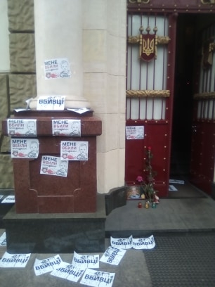 Активісти, яких прийшло кілька десятків, тримають в руках плакати із надписами: "Поліція з народом чи з міністром?", "Рядові вбивають Аваков покриває", "Ми за чесне покарання вбивць", "Я не хочу бути наступним" та "Авакова у відставку".