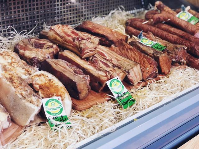 "Я відвідала кожне виробництво, товар якого тут продаю, – розповідає власниця «Верховини» Ольга. – Бачила, як коптять ковбасу і шинку. Для цього використовують спеціальні дрова – лише з вишні. Фішка з м’ясних продуктів – це, напевно, гуцульська ковбаса, яка полюбилася покупцям за оригінальний смак, а ще сало по-гуцульськи (воно варене з часником і натерте спеціями)".