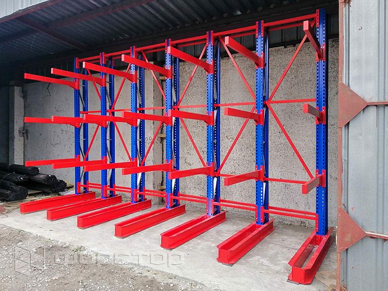 - консольні. Їх виготовляють для розміщення та зберігання довгих вантажів, наприклад, труб або пиломатеріалів. Вони бувають односторонніми, двосторонніми та ялинковими.