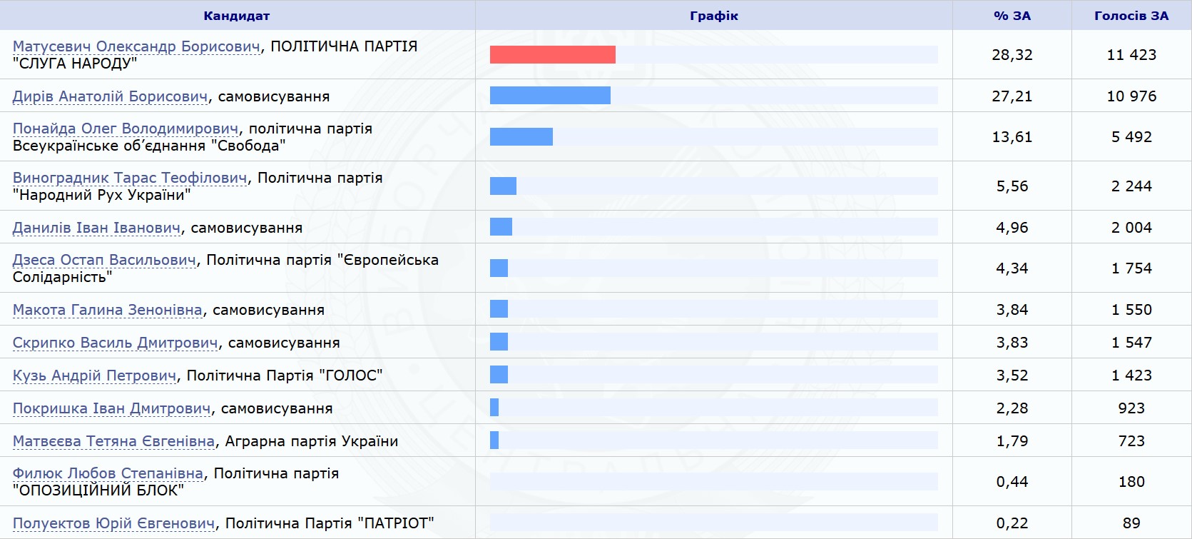 ОВК №86 (Долина). Тут ще вранці перемагав самовисуванець і чинний нардеп Анатолій Дирів. Проте наразі лідером є Олександр Матусевич - 11 423 (28,32%), а у Диріва - 10 976 (27,21%)