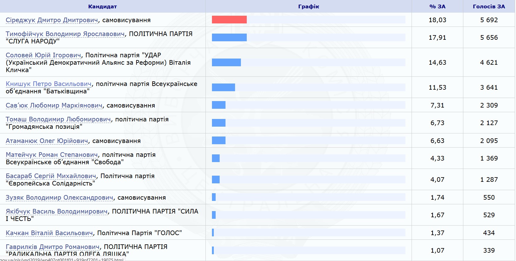 На 89-му окрузі із відбулася також заміна лідера. Тепер першість має незначним відривом поки перемагає висуванець самовисуванець Дмитро Сіреджук - 5 692 (18,03%). Йому у спину дихає  "Слуги народу" Володимир Тимофійчук - 5 656 (17,91%)