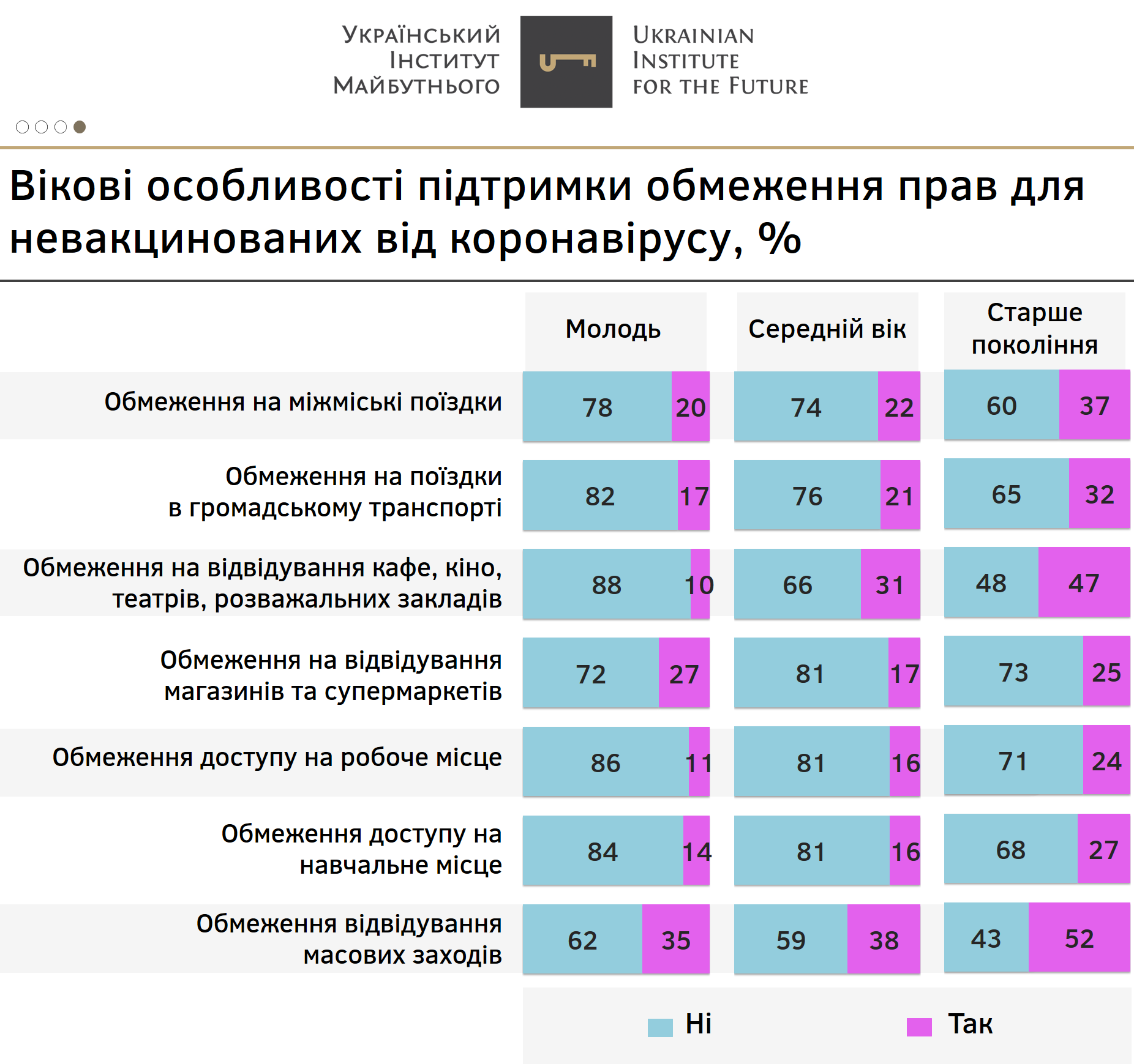 За виключенням того, що старше покоління радше підтримало б для таких людей заборону відвідувати масові заходи, а також відвідування кафе, кінотеатрів та інших розважальних закладів.