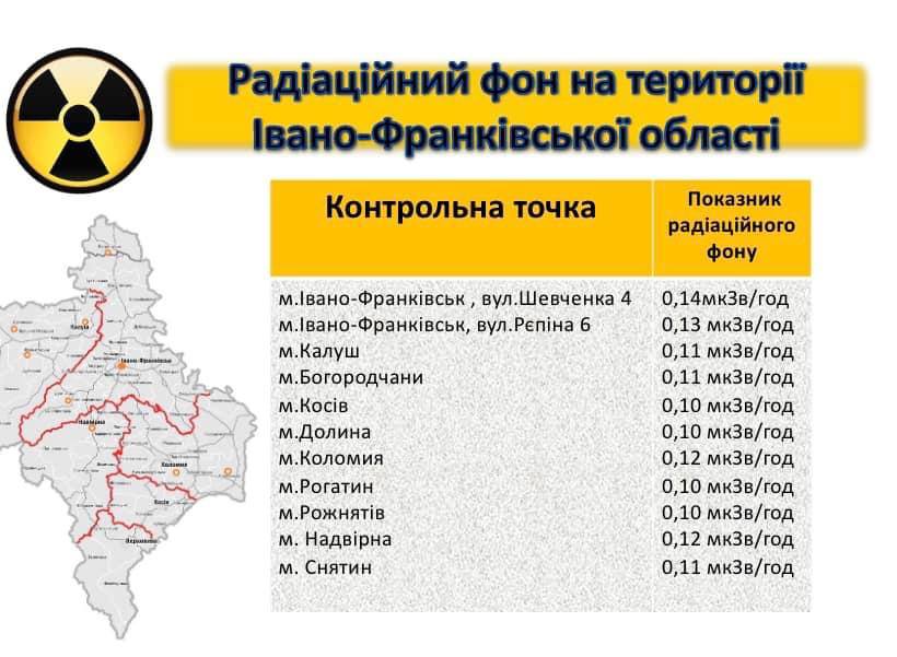 Тим часом найвищий радіаційний фон на Івано-Франківщині спостерігають в Івано-Франківську на вул. Шевченка, 4. Зокрема, він становить 0,14 мкЗв/год.