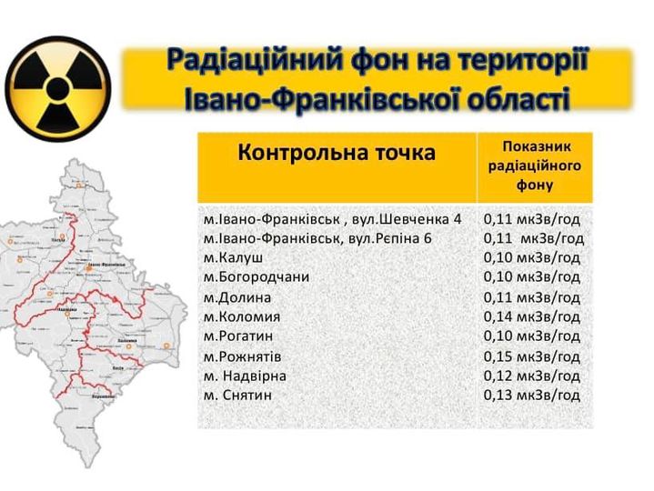 Відтак, найвищий рівень радіаційного фону зафіксували в місті Рожнятів - 15 мкЗв/год.
