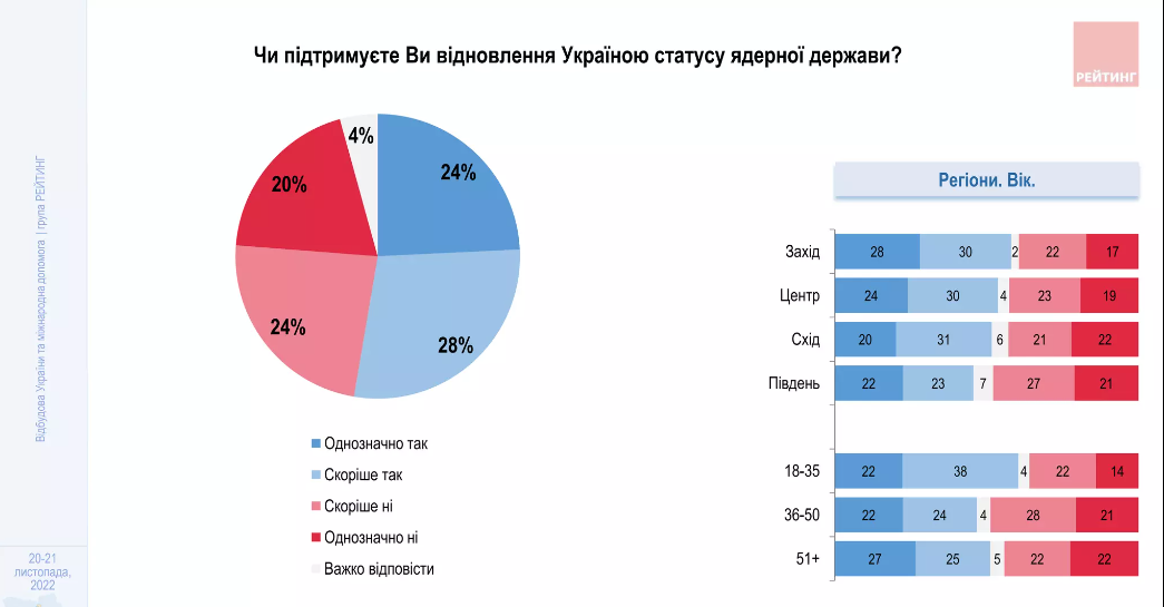 У цілому кількість тих, хто підтримує відновлення Україною статусу ядерної держави, зросла з 47% у 2019 році до 53% у 2022 році.