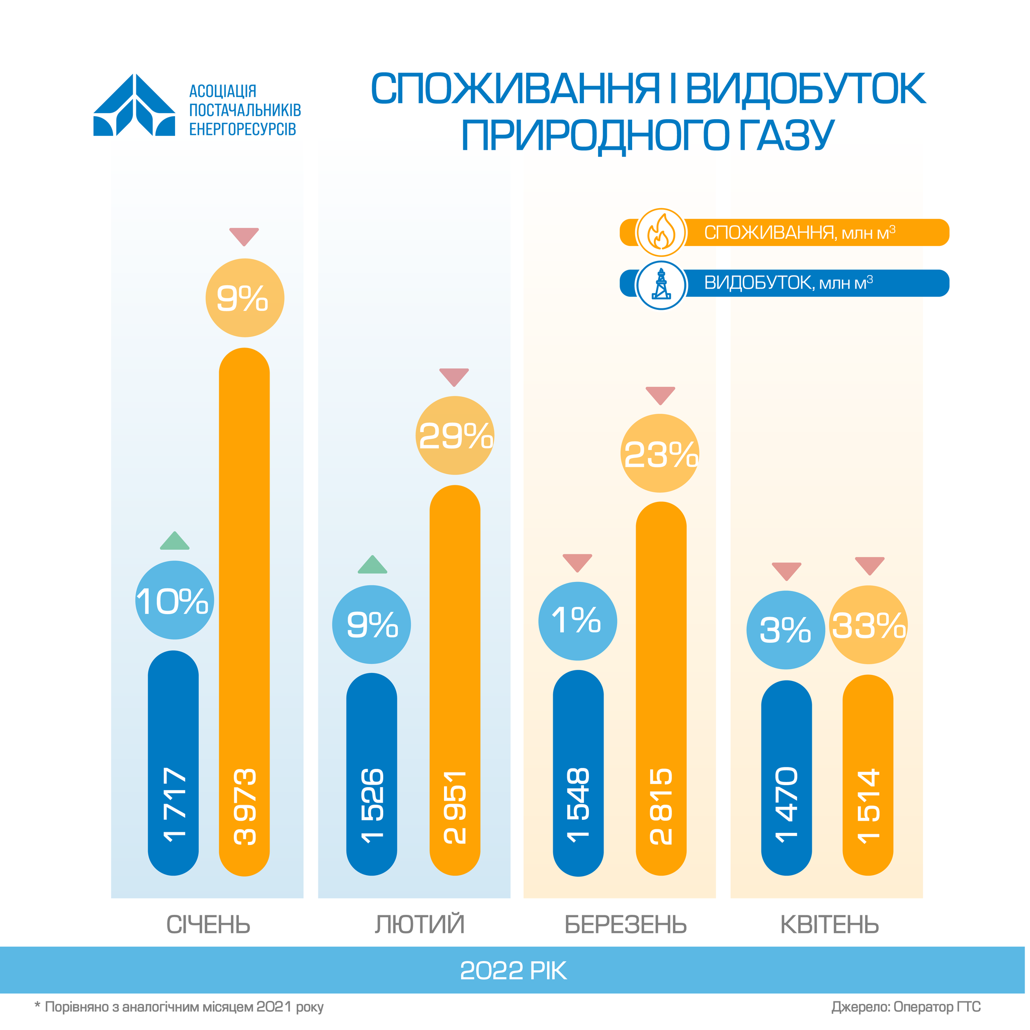 Водночас споживання природного газу в Україні падало більш стрімкими темпами через значні руйнації, завдані українським містам російськими окупантами. Якщо у січні споживання блакитного палива знизилося на 9%, у порівнянні з січнем 2021 року, то у лютому воно впало вже на 29%, у березні – на 23%, а у квітні – майже на 33%.