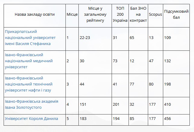 Рейтинг вищих навчальних закладів Івано-Франківська:
