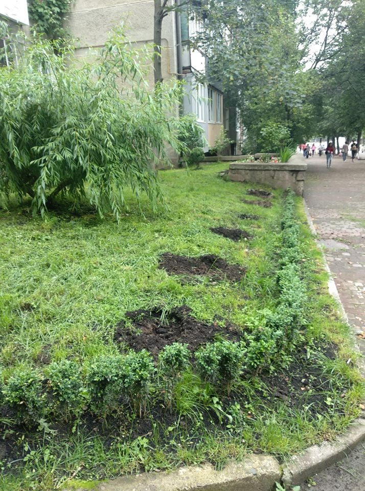 У ніч із 15 на 16 червня невідомі викопали десять півтораметрових туй, які прикрашали вулицю Коновальця поруч будинку №90.
