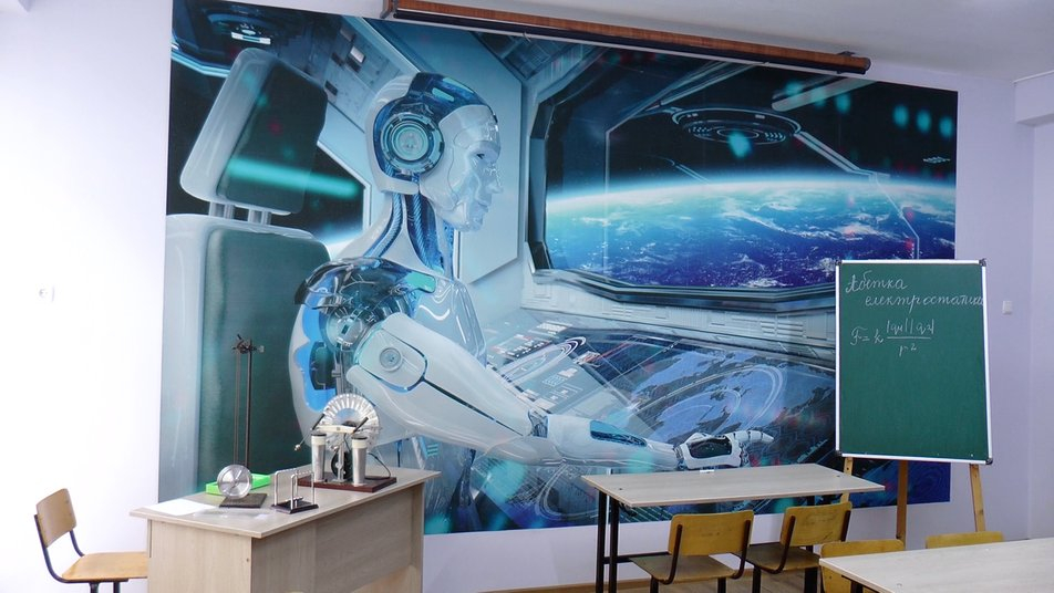 Яскравих кольорів їдальня, лабіринти, англійський алфавіт, сонячна система та математичні сходинки на стінах та підлозі, STEM-лабораторія.