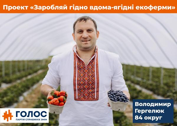 Кандидат в народні депутати Володимир Гергелюк ініціював проект: «Заробляй гідно вдома - ягідні екоферми», щоб показати, які можливості є вже зараз для того, щоб мати європейські доходи.