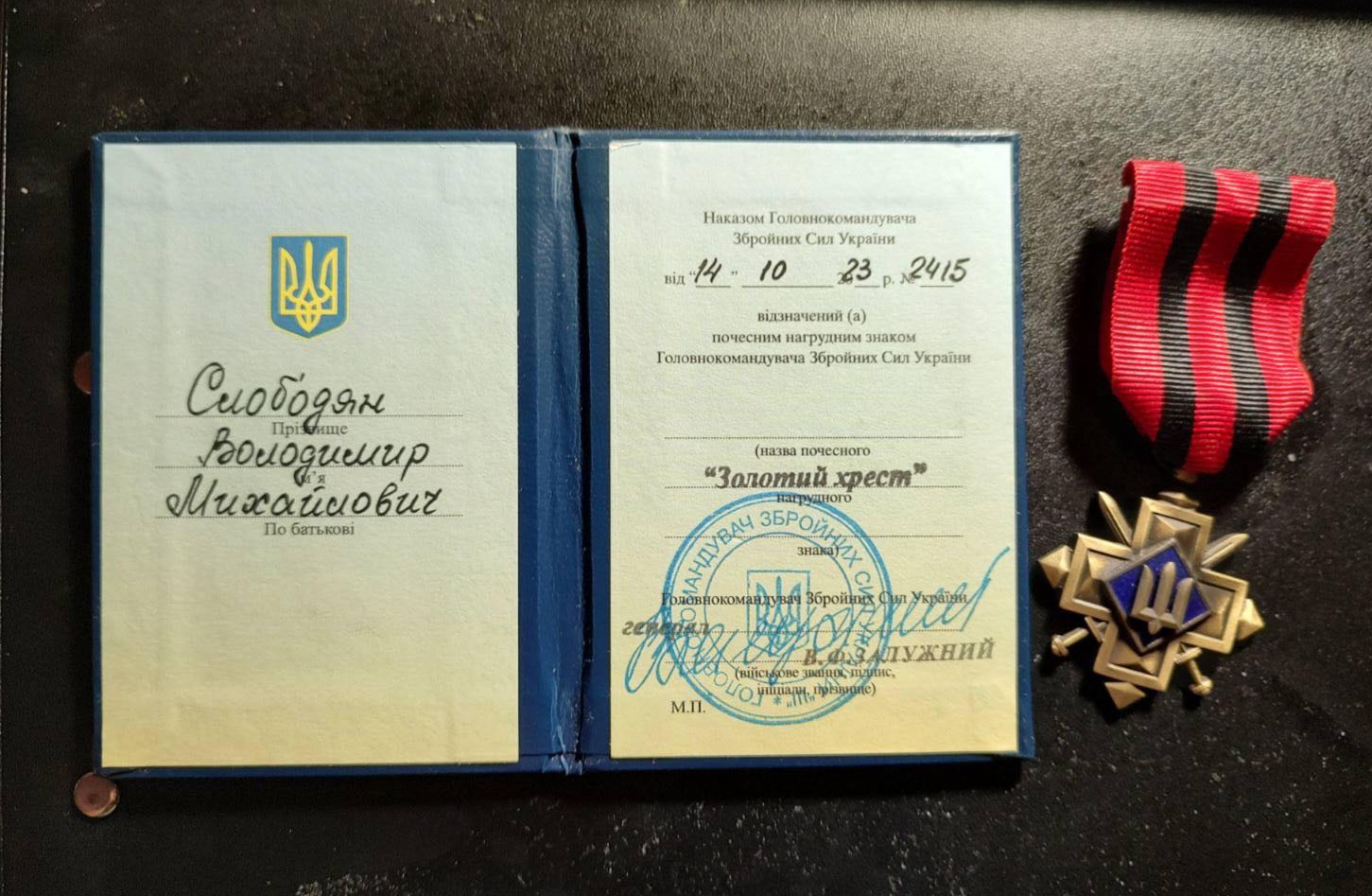 Військовослужбовець Володимир Слободян, за успішне виконання бойових завдань, відзначений почесним нагрудним знаком Головнокомандувача Збройних Сил України Валерія Залужного "Золотий хрест" та цінним подарунком від Командувача сухопутних військ ЗСУ Олександра Сирського.
