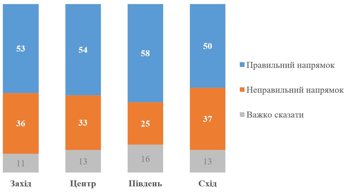 Незалежно від регіону проживання приблизно однакова частка населення (50-58%) вважають, що справи в Україні рухаються у правильному напрямку (і частка тих, хто так вважає, переважає частку тих, хто бачить неправильний шлях розвитку країни).
