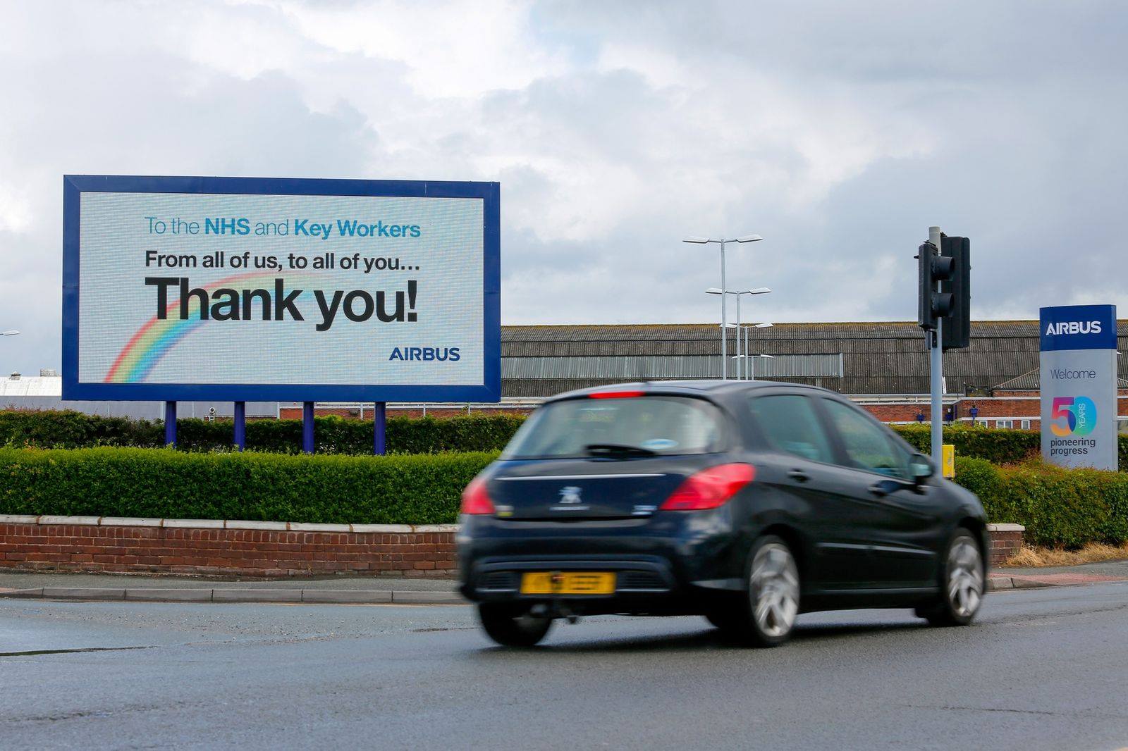 Повідомлення з подякою Національній службі охорони здоров’я (NHS) Великобританії та ключовим працівникам, розміщене біля заводу.