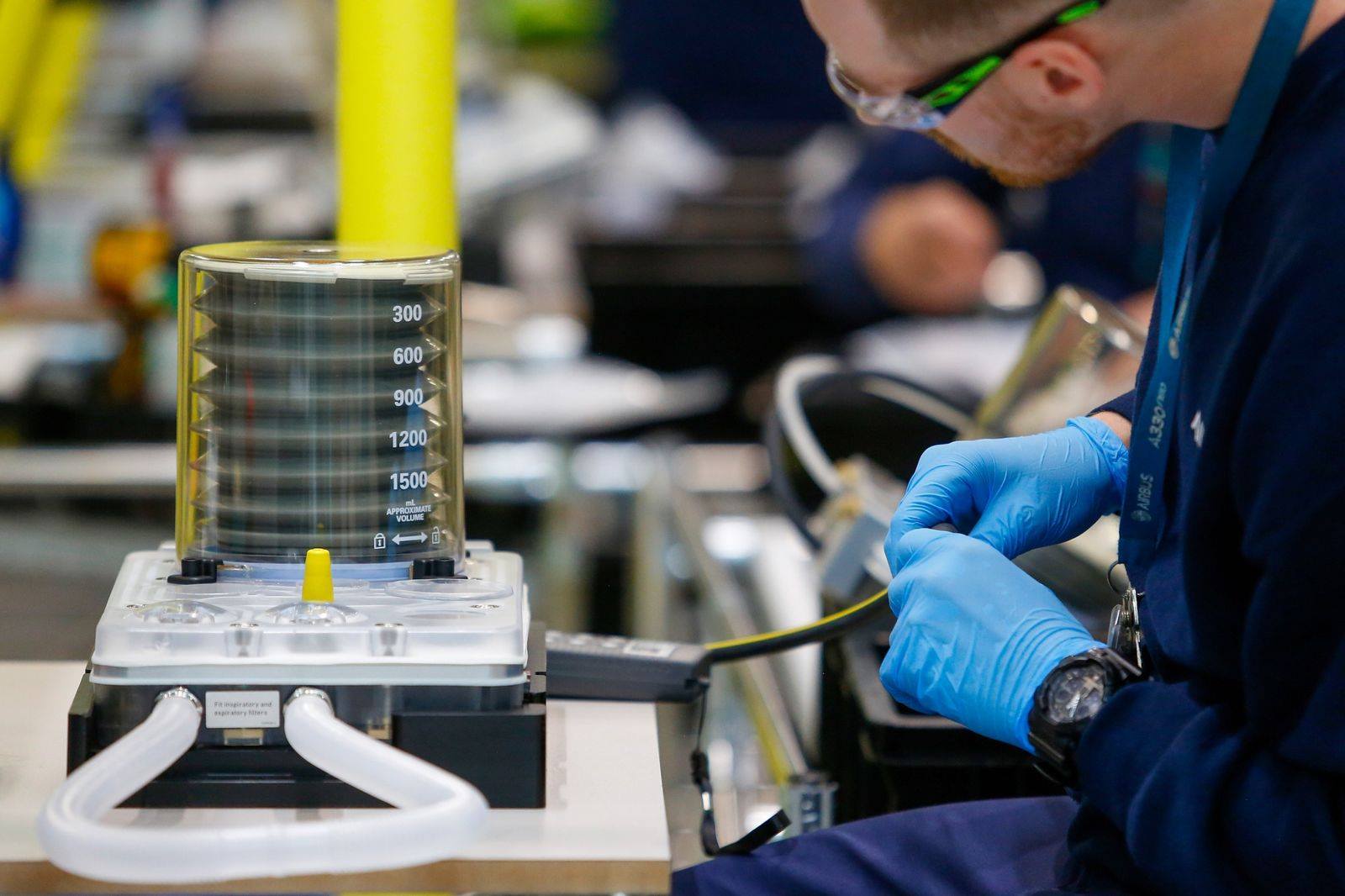 Монтаж вентилятора також проходить поетапний процес, розроблений Siemens, щоб дозволити інженерам-новачкам , хоча і дуже кваліфікованим, взятися за роботу. Щоб зібрати труби для повітря та кисню, Ґрін потрібно 25 хвилин. Консорціум Ventilator Challenge UK, членом якого є Airbus, повинен виробляти 15 000 медичних виробів протягом 10 тижнів за державним контрактом на суму 100 мільйонів фунтів (125 мільйонів доларів).
