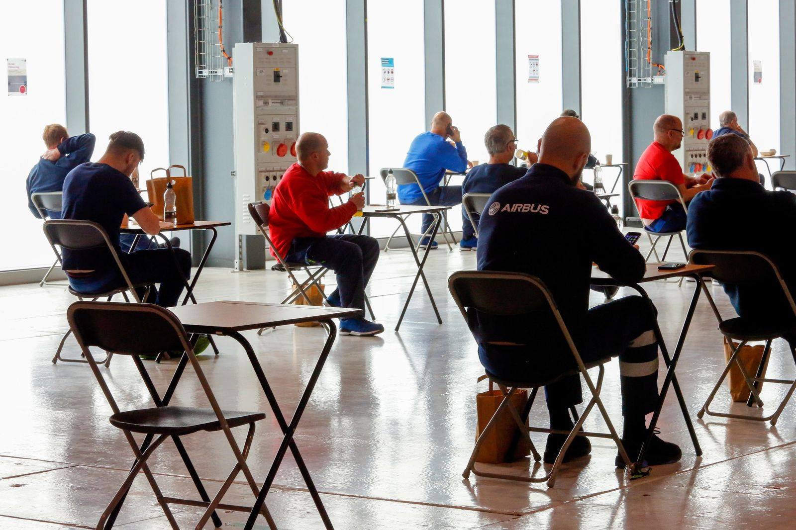 30 квітня працівники працюють на виробничій лінії вентилятора в адаптованому ангарі на складальному заводі Airbus у Броутоні.