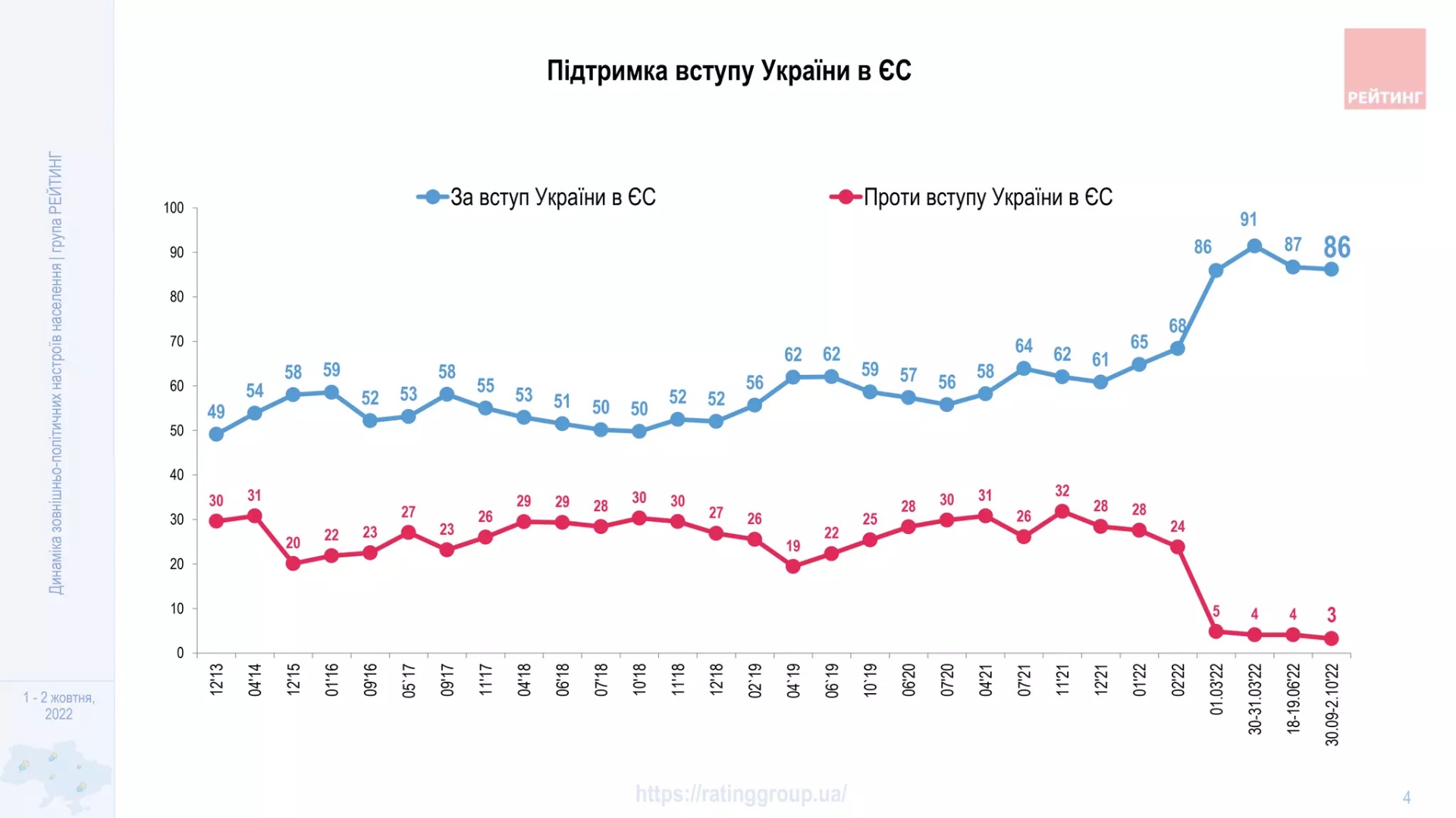 На графіку динаміки настроїв українців з 2013 року показано, що наприкінці 2013 року підтримували вступ до Євросоюзу 49% громадян України та 30% були проти.