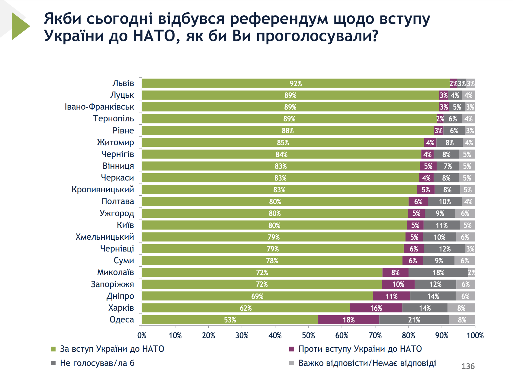 Так, серед мешканців Івано-Франківська підтримка євроатлантичної інтеграції складає 94%. У випадку вступу до НАТО підтримка складає 89%.