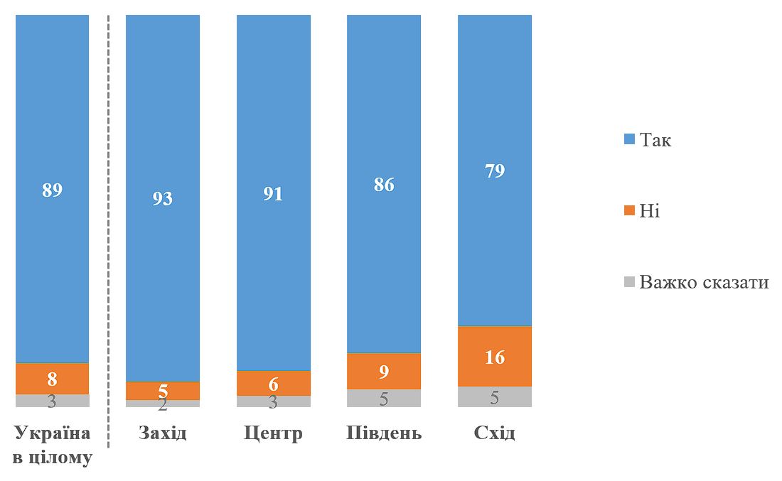 Так, 89% українців хочуть бачити Україну в складі НАТО, причому у всіх регіонах абсолютна більшість підтримують такий крок: від 79% на Сході до 93% на Заході.