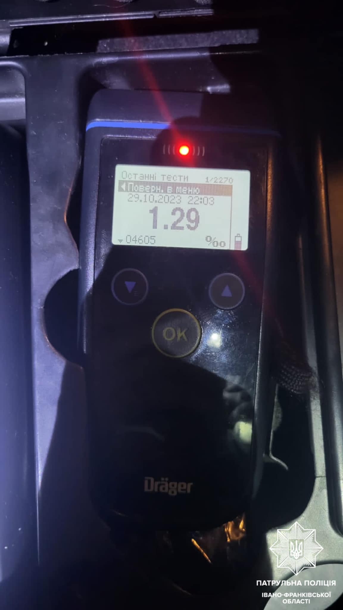 Спілкуючись з 29-річним водієм патрульні виявили ознаки алкогольного сп’яніння. Інспектори запропонували водію пройти перевірку на стан сп'яніння. Результат огляду — 1.29 проміле алкоголю у крові.