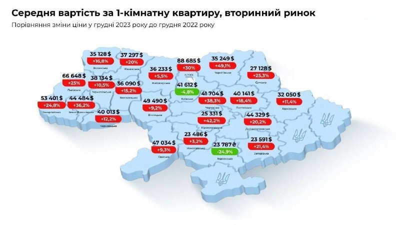 Станом на грудень 2023 середня вартість квартири в Україні виросла на 6%, а будинку — впала на 7,5%.