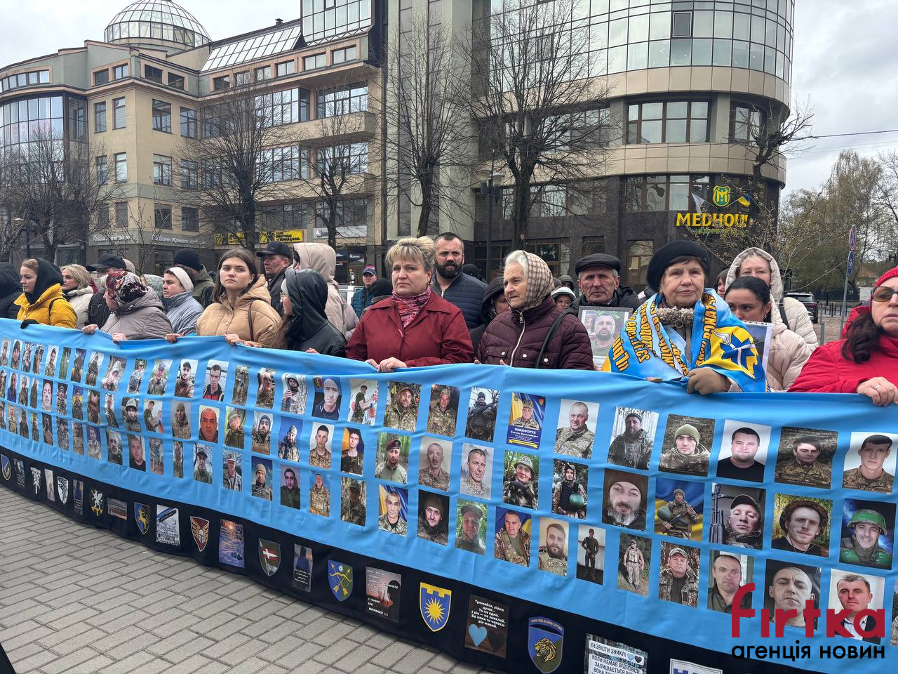 Громадські спілки родин зниклих безвісти організували банери та прапори зі своїми рідними, яких вони очікують.