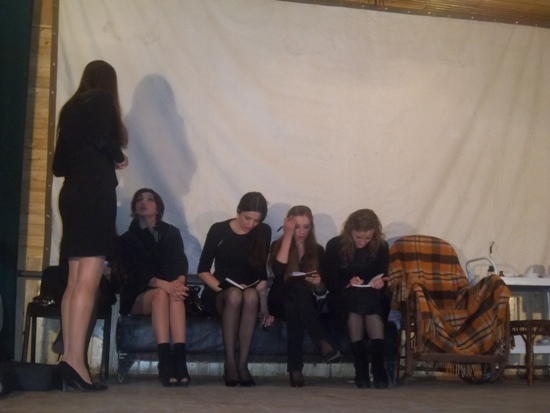 Ще до початку вистави актори на чолі з режисером черговий раз прогонять сценарій пристосовуючись до теперішніх умов сільської, не завжди достатньо зручної, сцени.