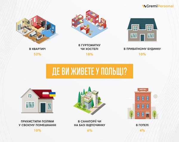 Так, 58% опитаних винаймають житло за власний кошт, 22% забезпечують житлом роботодавці. 10% респондентів кажуть, що їх прихистили поляки у своєму житлі, яким уряд сплачує компенсацію за кожного біженця у рамках програми прихистку. 5% живуть коштом держави й 5% за допомоги благодійних організацій.