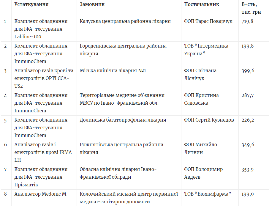 «Центральна районна лікарня Калуської міської та районної рад» 6 липня уклала угоду на закупівлю комплекту обладнання для проведення досліджень методом ІФА з приватним підприємцем Тарасом Поварчуком.