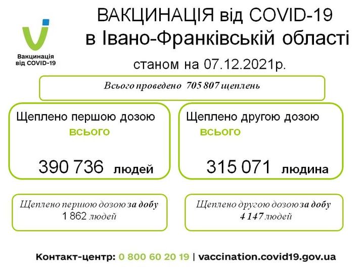 Станом на сьогодні, 7 грудня, 705 807 прикарпатців щепилися від COVID-19.