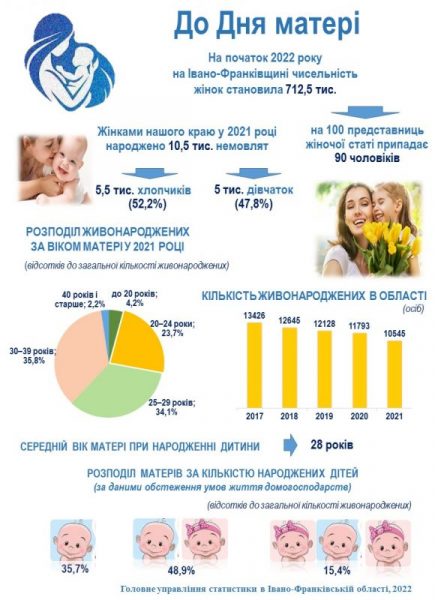 До слова, за минулий рік мешканки Прикарпаття народили 10,5 тисяч немовлят. З них 5,5 тисяч (52,2%) хлопчиків та 5 тисяч (47,8%) дівчаток.