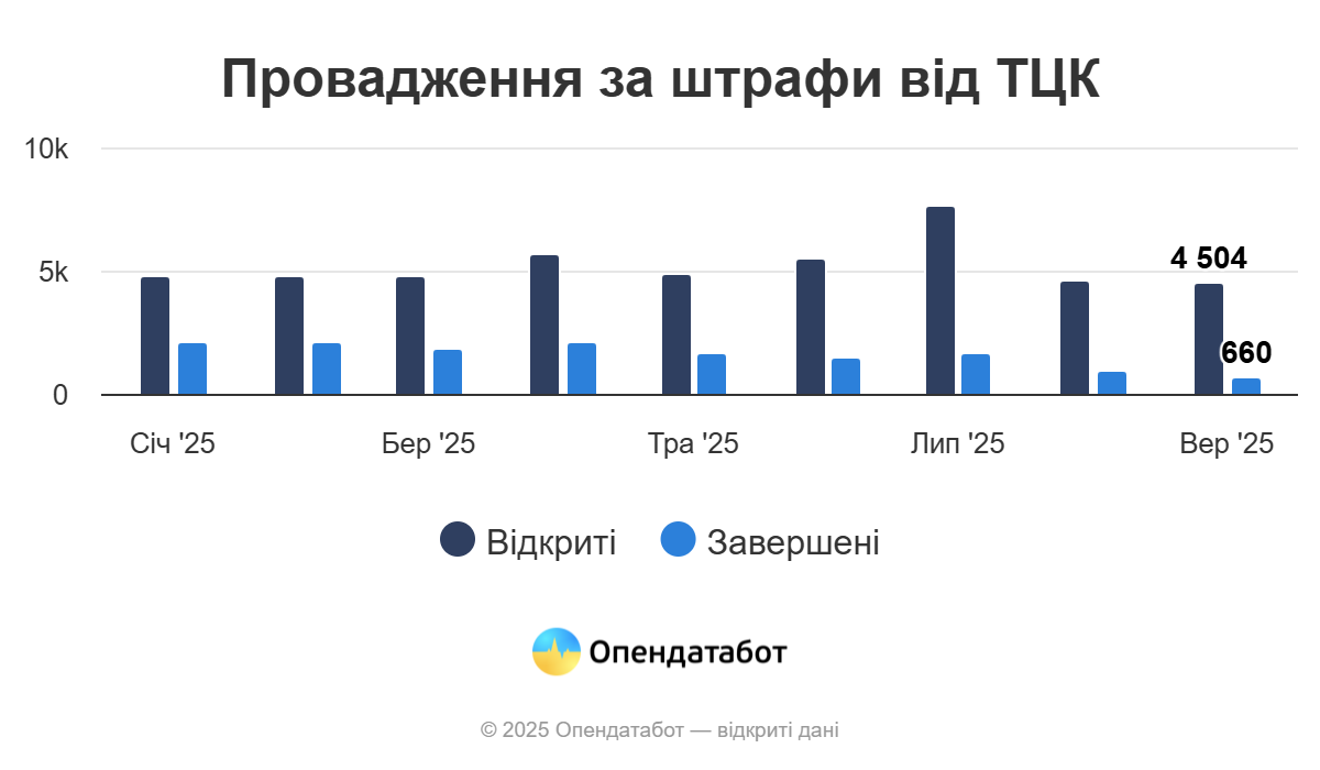У середньому щомісяця ТЦК відкривають по 4,5 тисячі нових проваджень. Однак липень став рекордним — 7 595 відкриттів. Левова частка липневих штрафів припала на столицю: 26% або 1 999 проваджень.