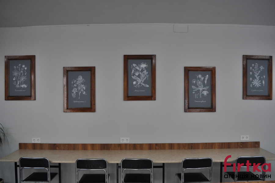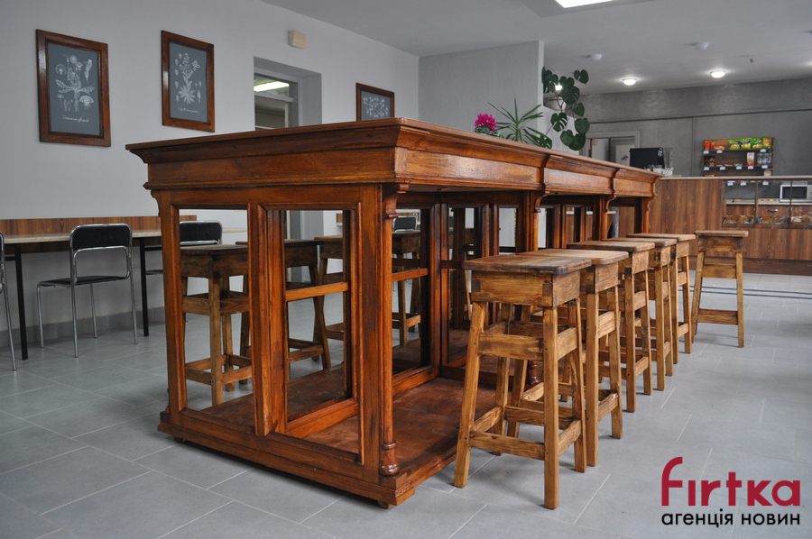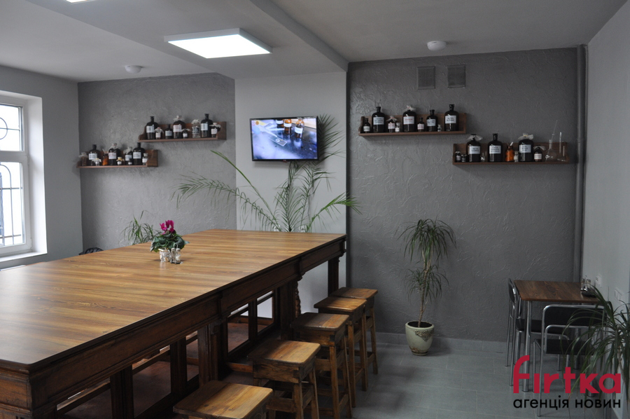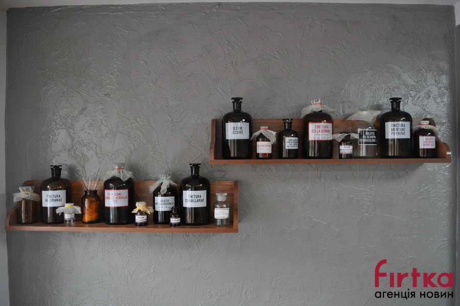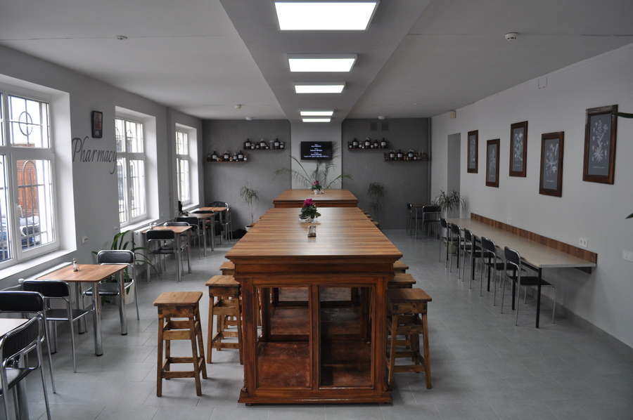 Доповнюють фармацевтичний антураж полиці з вінтажними штангласами та іншим лабораторним посудом. Особливого стилю інтер'єру додали столи, зроблені зі старовинних шаф, які колись стояли на кафедрі патологічної анатомії, та через вік вже не використовуються.