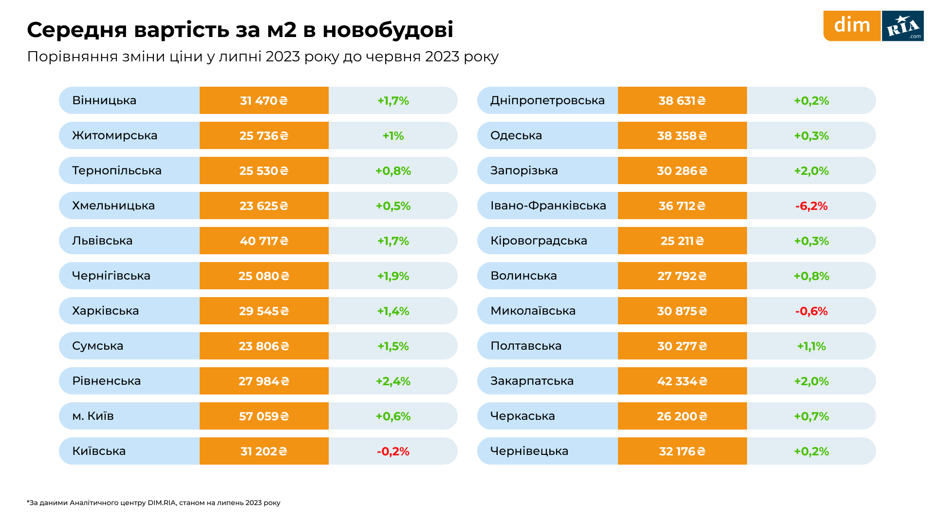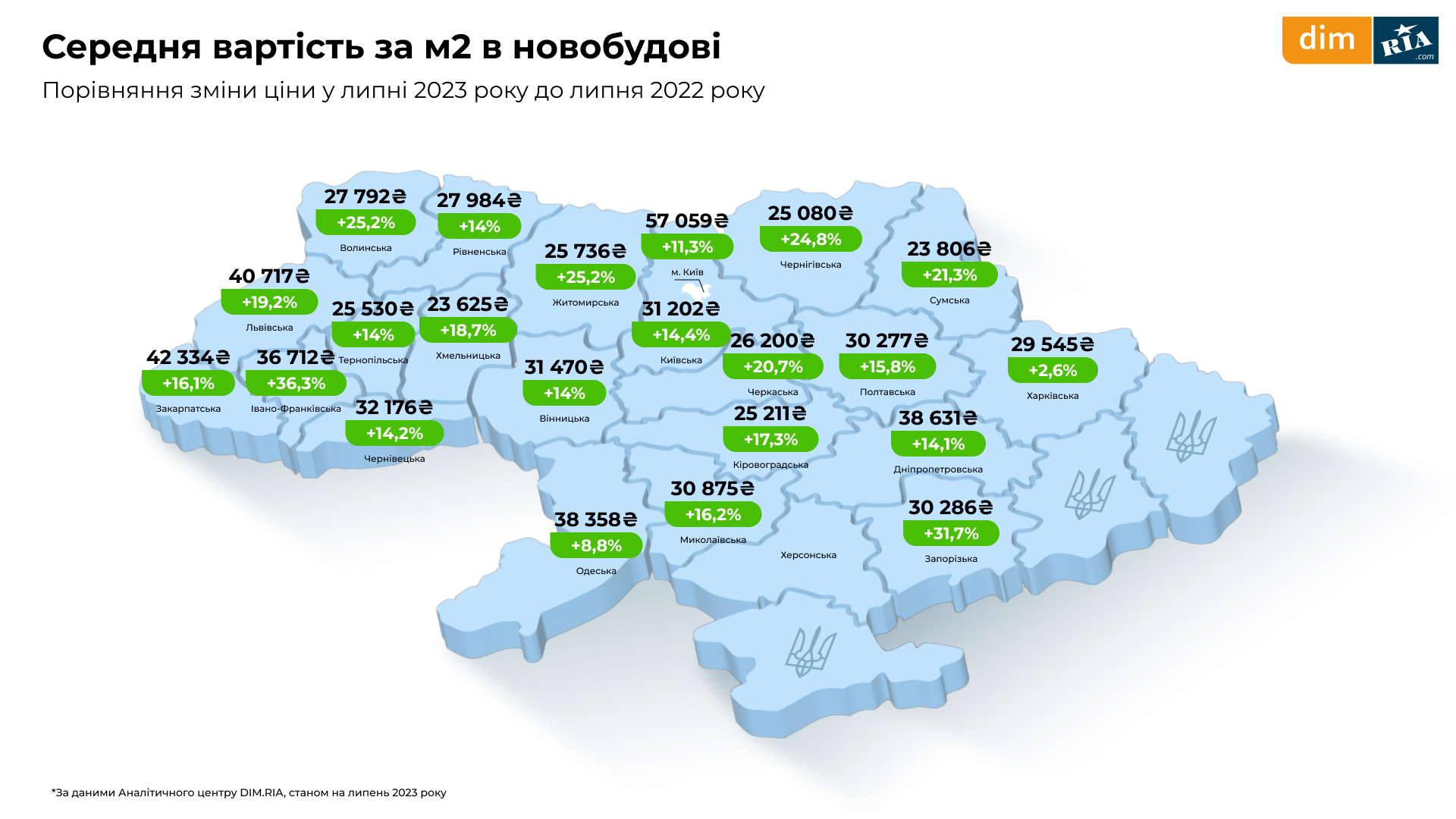 Станом на липень, найвища середня вартість за м² у столиці — складає 57 059 гривень (враховуючи всі типи квартир за кількістю кімнат), а найнижча ціна за м² наразі у Хмельницькій області — 23 625 гривень.