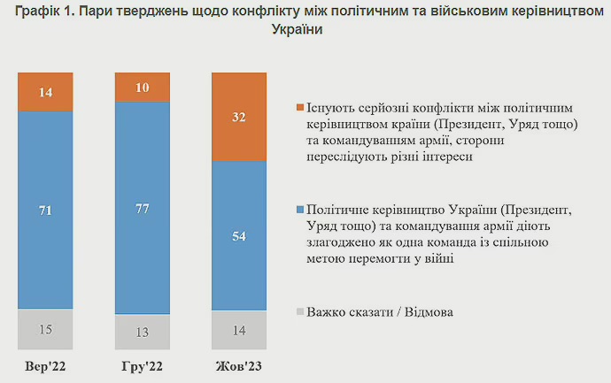 Так, за останній рік з 14% до 32% стало більше тих, хто вірить у наявність серйозних конфліктів між політичним керівництвом країни та командуванням армії.