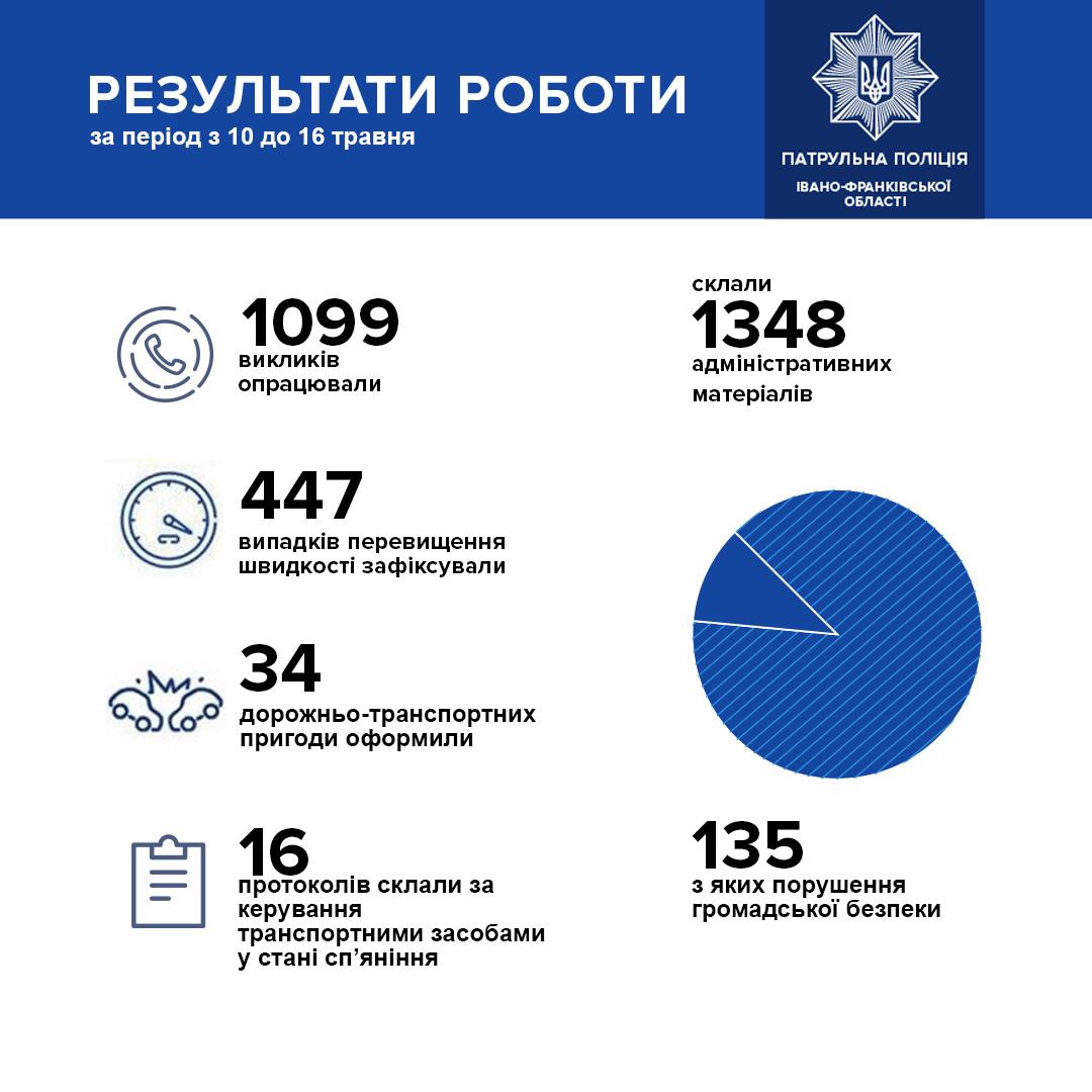 За період з 10 по 16 травня патрульна поліція Івано-Франківської області опрацювала 1099 викликів.