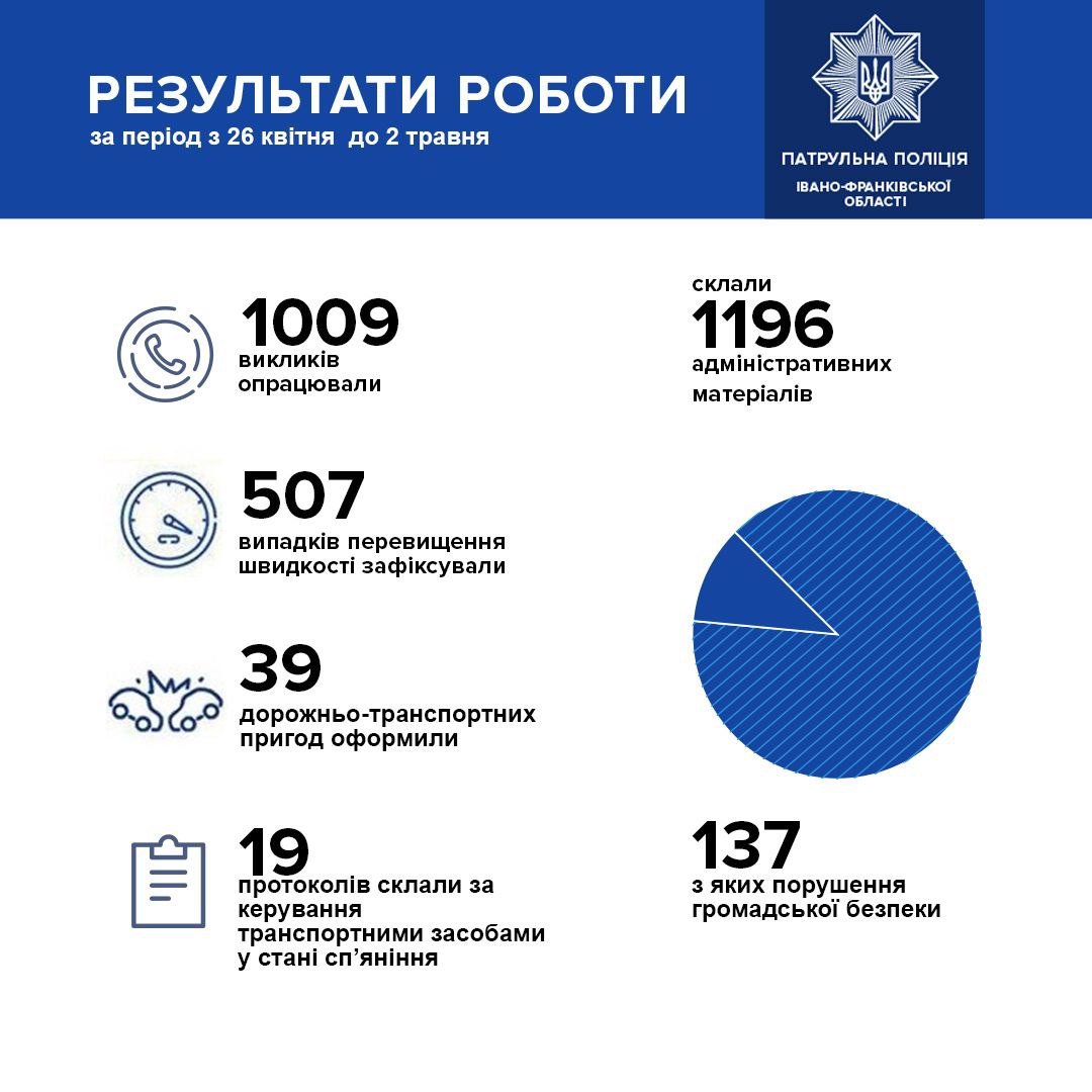 За період з 26 квітня по 2 травня патрульна поліція Івано-Франківської області опрацювала 1009 викликів.