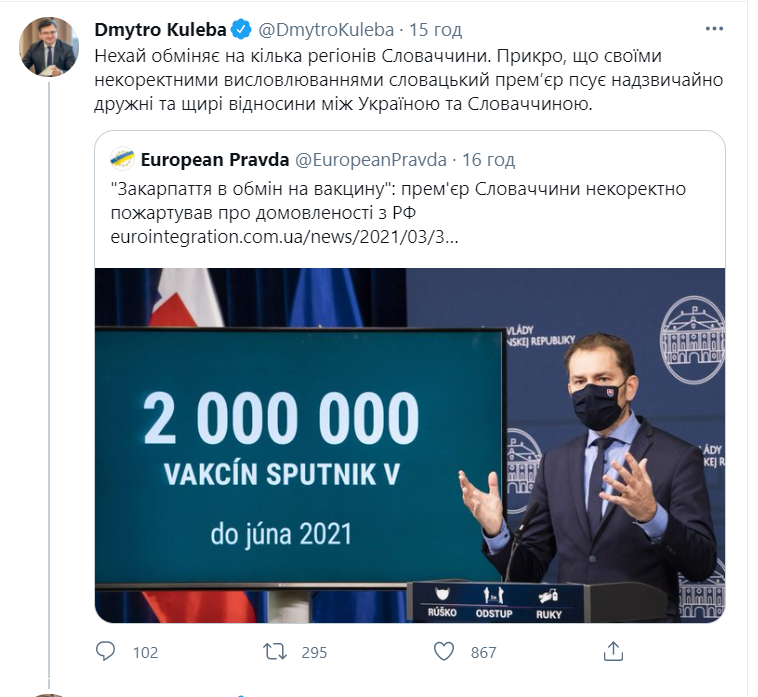 "Нехай обміняє на кілька регіонів Словаччини. Прикро, що своїми некоректними висловлюваннями словацький прем’єр псує надзвичайно дружні та щирі відносини між Україною та Словаччиною.", - відреагував Кулеба у Твіттері.