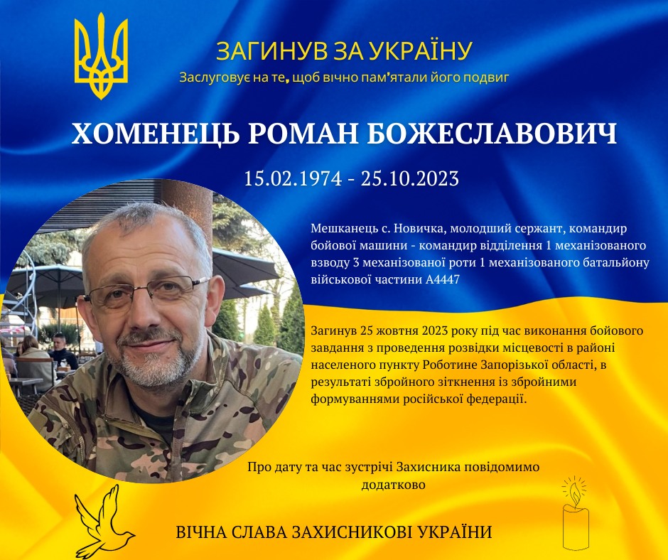 На Запорізькому напрямку загинув прикарпатський боєць, молодший сержант Роман Хоменець.