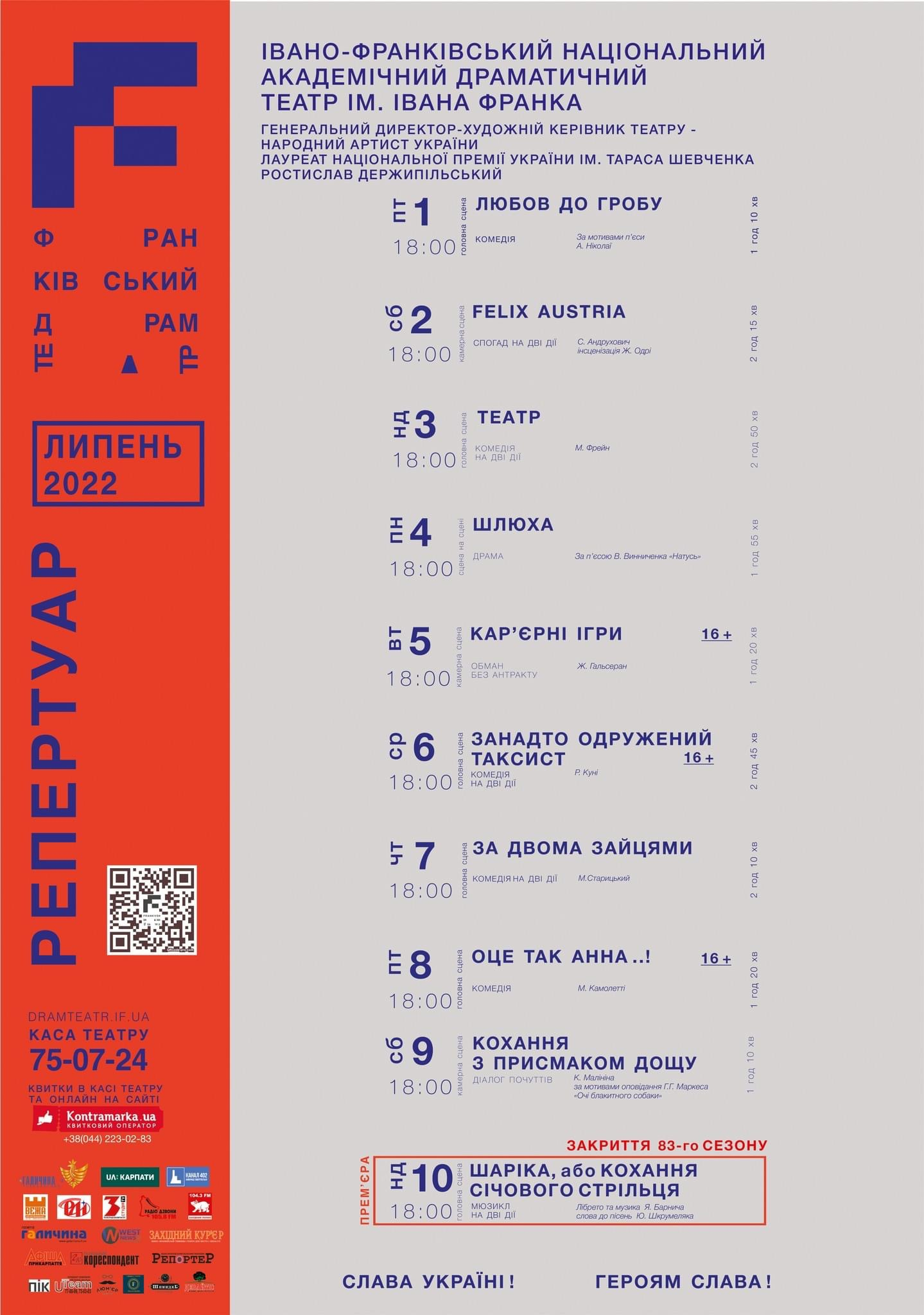 Зауважимо, що усі вистави липневого репертуару розпочинаються о 18:00 годині.