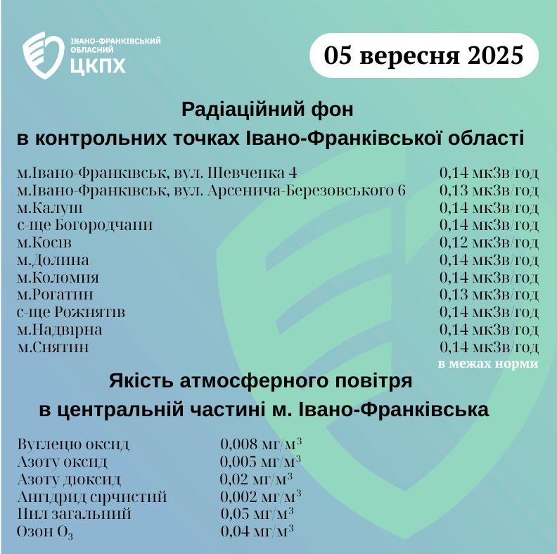 Станом на ранок п'ятого вересня показники радіаційного фону в Івано-Франківській області становлять від 0,12 мкЗв/год до 0,14 мкЗв/год.