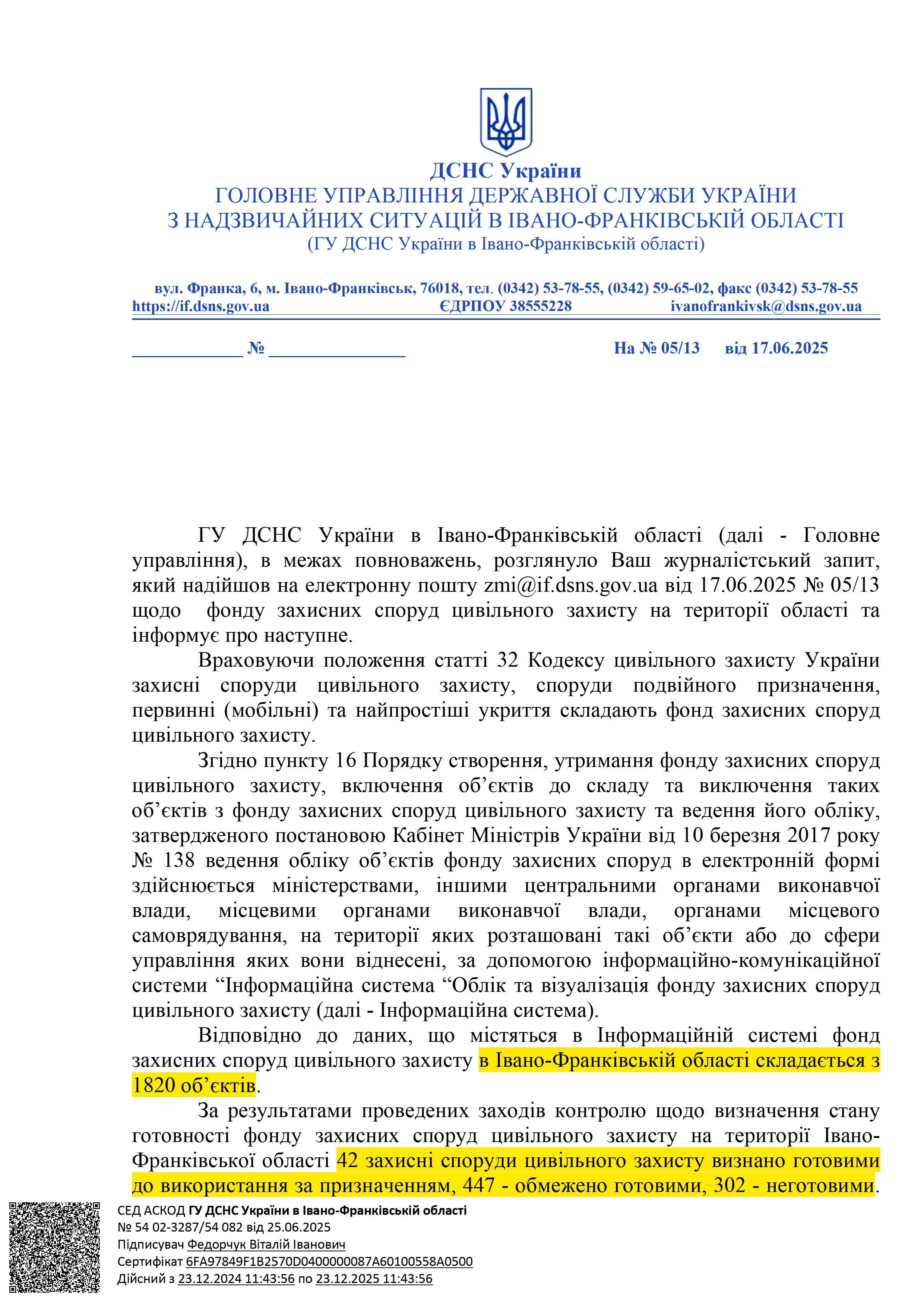 За даними ДСНС, в Івано-Франківській області зареєстровано 1 820 захисних об’єктів, серед яких споруди цивільного захисту, об’єкти подвійного призначення, мобільні укриття та найпростіші укриття. З них лише 42 укриття повністю готові до експлуатації, 447 мають обмежену готовність, а 302 визнані неготовими.