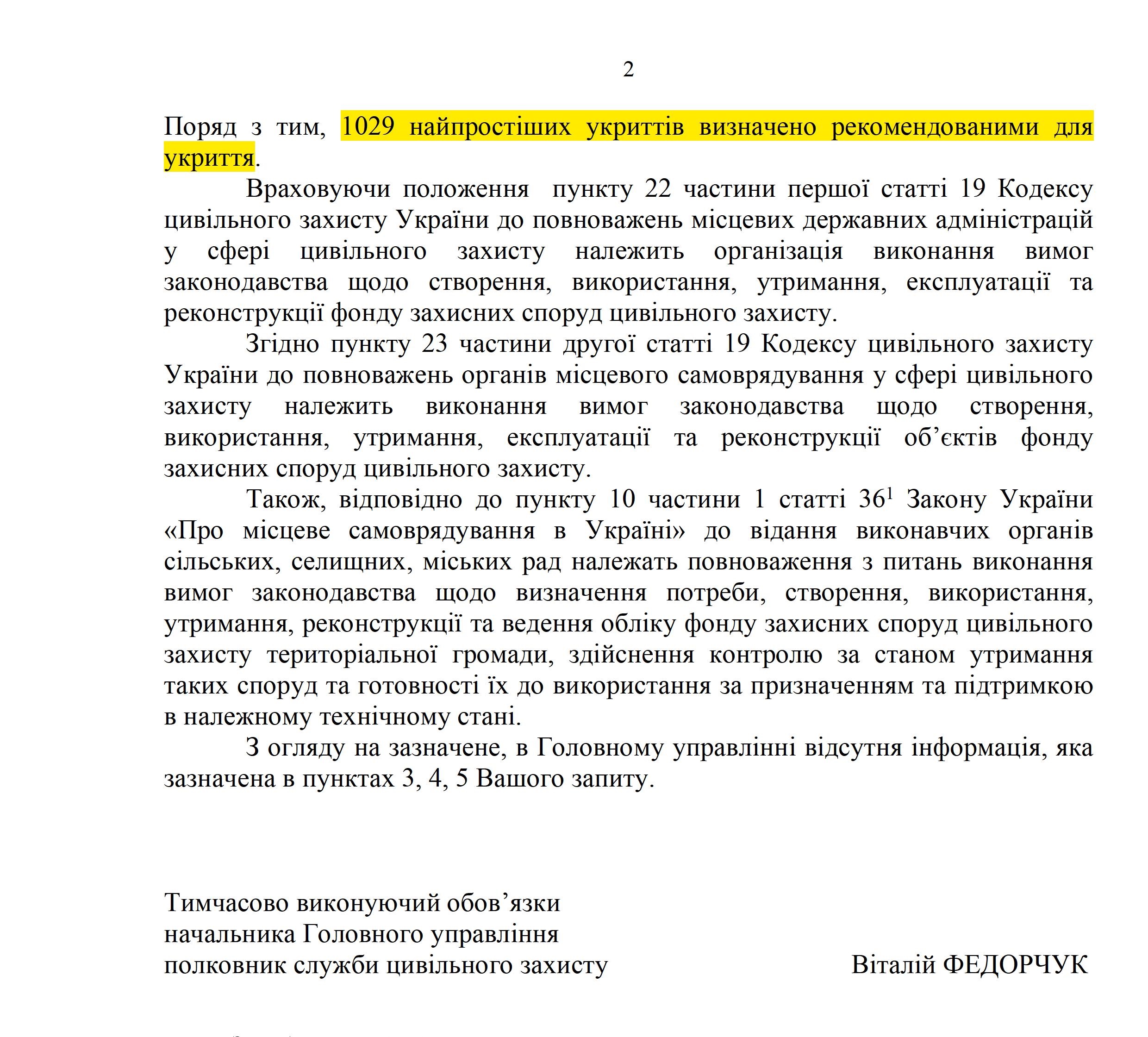 Водночас 1 029 найпростіших укриттів рекомендовано до використання: хоча вони не відповідають усім критеріям, але забезпечують певний рівень захисту.