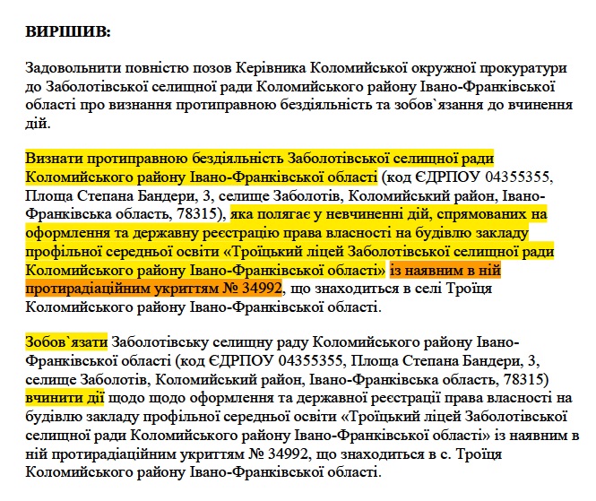 Рішення було ухвалене 21 серпня 2025, коли розглянули позов Коломийської окружної прокуратури проти Заболотівської селищної ради щодо бездіяльності в реєстрації права власності на будівлю Троїцького ліцею з протирадіаційним укриттям №34992 в селі Троїця.