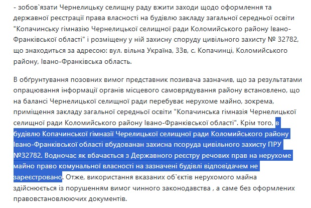 Керівник Коломийської окружної прокуратури звернувся з позовом до Чернелицької селищної ради про визнання бездіяльності протиправною та зобов'язання зареєструвати право власності на будівлю Копачинської гімназії з вбудованою захисною спорудою цивільного захисту № 32782 (протирадіаційне укриття на 220 осіб, площею 178 кв. м).