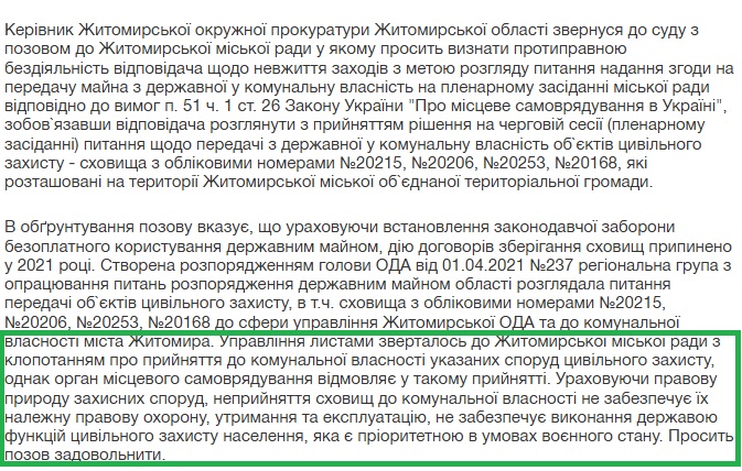 Інший приклад — судова практика в Житомирській області. У справі № 240/17/24 Житомирський окружний адміністративний суд розглянув позов прокуратури щодо неприйняття сховищ до комунальної власності.
