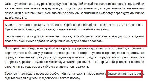 А нещодавно Верховний Суд України підтвердив, що прокурор не може заміняти суб'єкта владних повноважень, такого як ДСНС, яка сама не наділена правом звертатися до суду з позовами про приведення укриттів до належного стану.